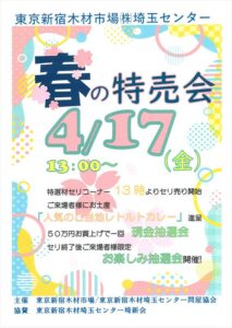 2026年4月17日に埼玉センターにて『春の特売会』を開催いたします。 2026年4月17日金曜日に埼玉センターにて『春の特売会』を開催いたします。 13時よりセリ売りを開始いたしますので、皆様のご来場をお待ちしております。